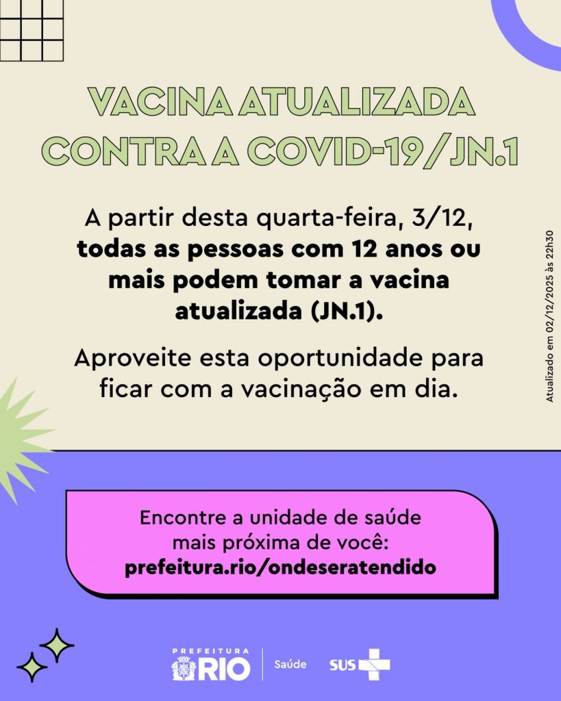 - 12 anos de idade ou mais: todas as pessoas podem receber uma dose da vacina contra covid-19/JN.1 a partir de 3/12/25.